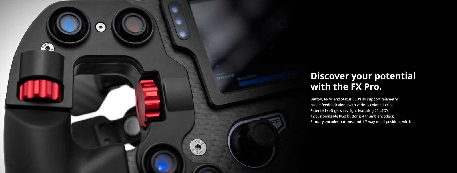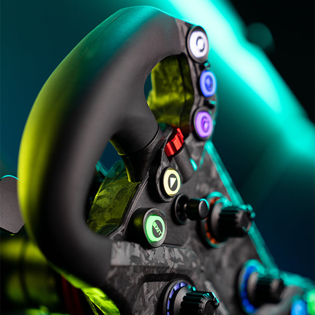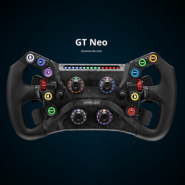 Introducing the Simagic GT Neo, a game-changer in sim racing steering wheels. Designed for comfort with an ergonomic build, it features 2 aluminum thumb encoders, 2 7-way switches, and 4 rotary encoders for precise control. Personalize your setup with 10 RGB buttons. Crafted with carbon fiber composites, it's lightweight yet robust. Elevate your racing experience with the Simagic GT Neo.