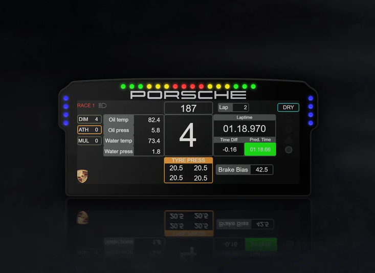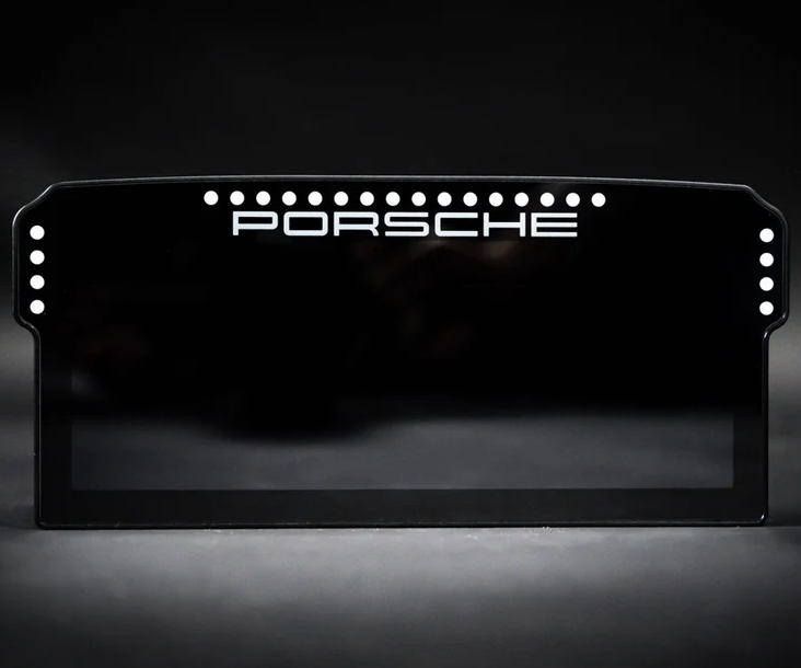 The Porsche 911 GT3 Cup Dashboard Display Unit is made using the best materials possible. The housing is milled from a single piece of aluminium. The glass has the Porsche logo silkscreened on it. The LCD screen is a high-quality 1920x720 resolution 10.3" screen running at 60Hz.