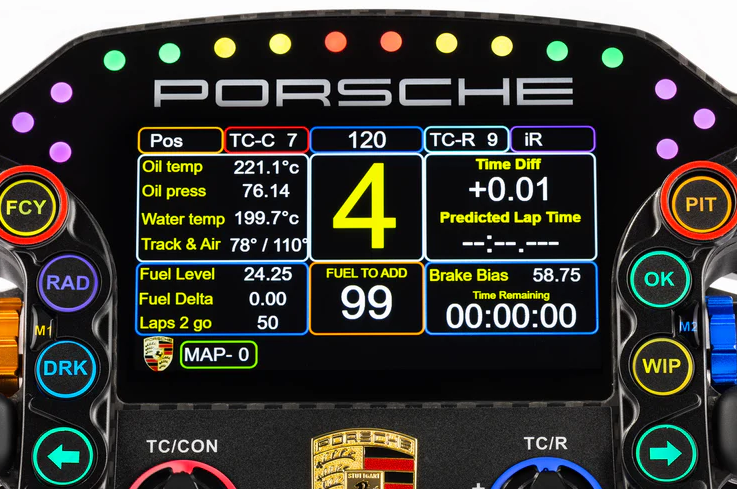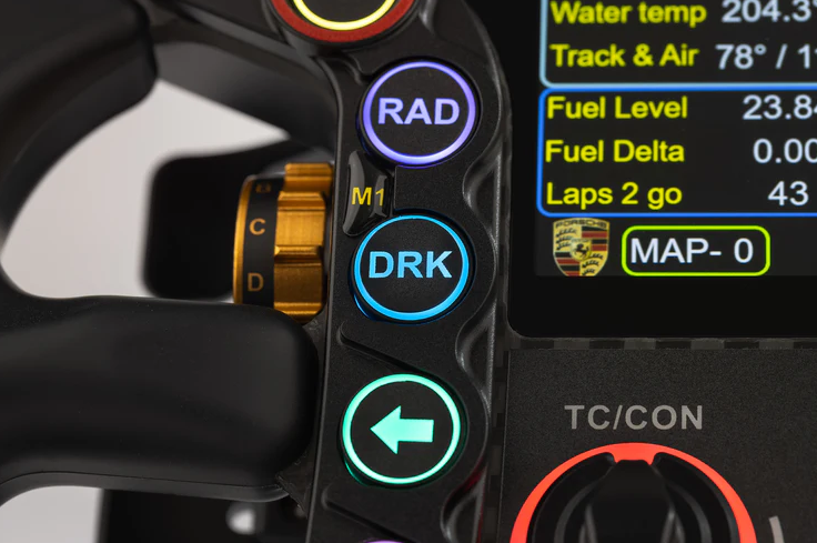 Utilizing our first-in-the-industry technology, customize your wheel with one of 16.7M colors. Each encoder and button features individually controlled LEDs, enabling dynamic effects like multi-color spin, fade, or flash for real-time visual feedback on flags or pit-limiters. Paired with a crisp, high-resolution display and a vibrant 300-lumen backlit panel, every detail remains sharp and legible, with fully adjustable brightness to suit your preferences.