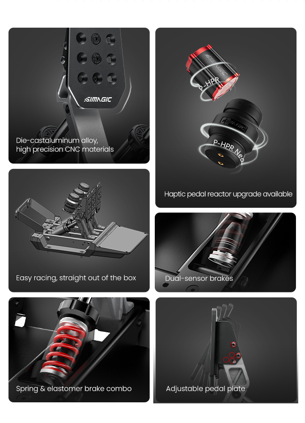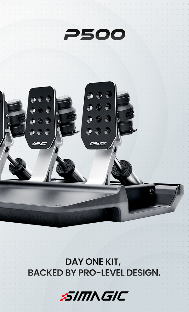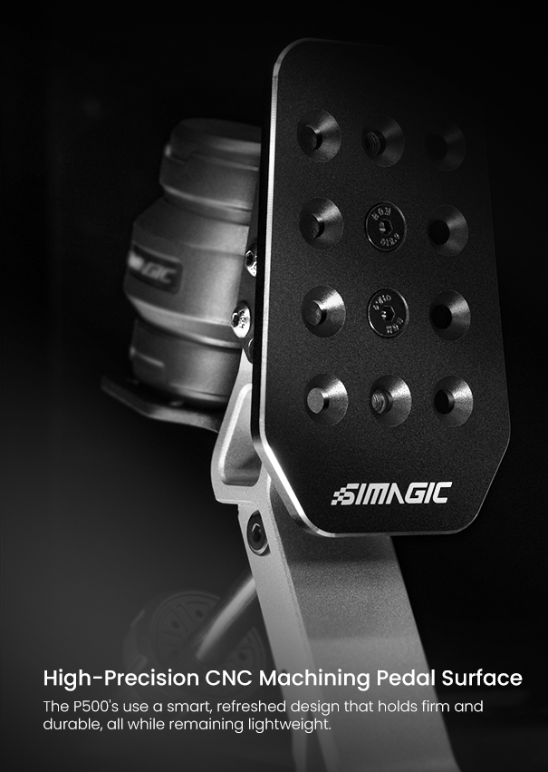 The Simagic P500 is an entry-level pedal set made from durable die-cast aluminum with precision CNC machining. It features a 100kg load cell, Hall angle sensor, adjustable resistance, and ergonomic design. With secure mounting options and SimPro Manager software, it offers solid control and customization for sim racing beginners.