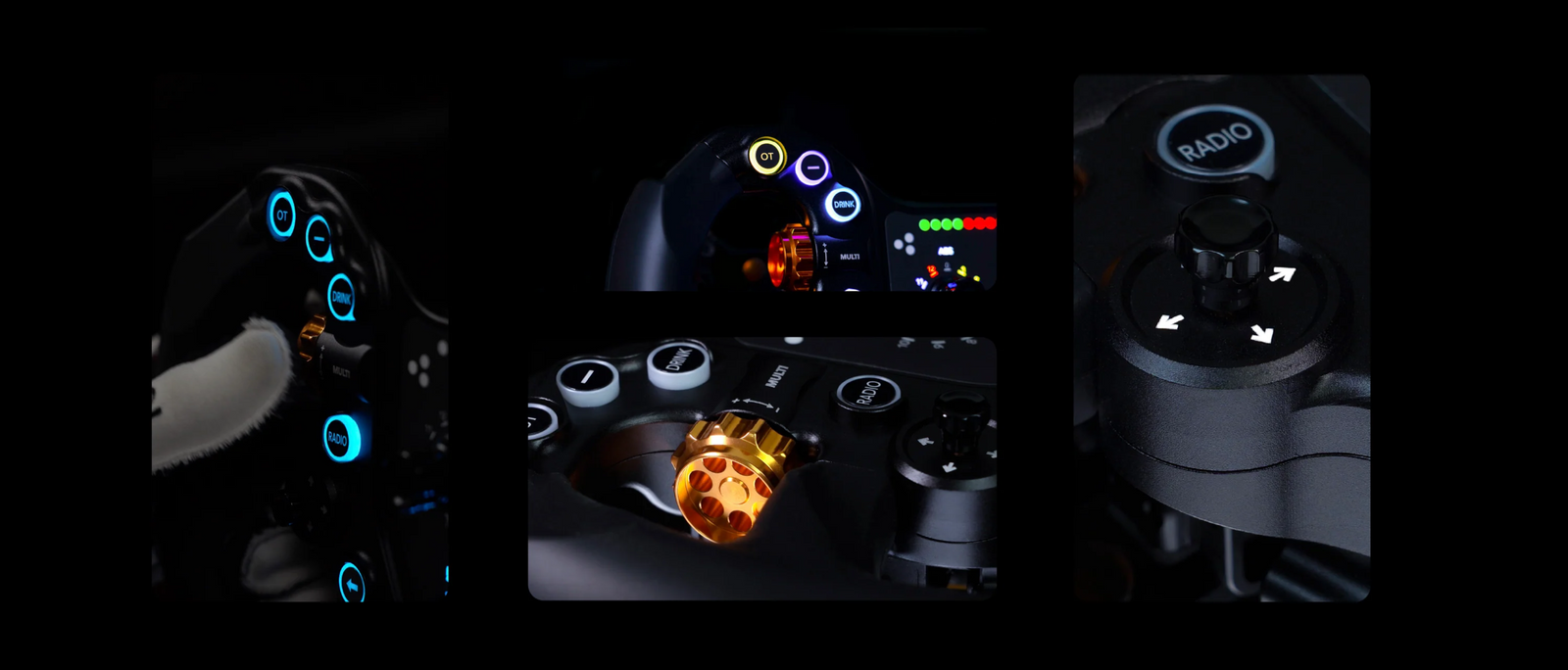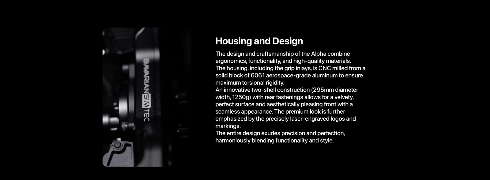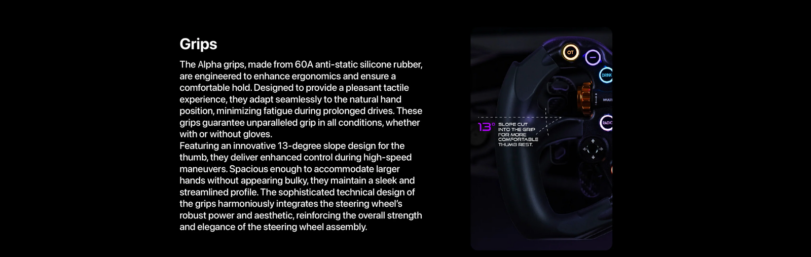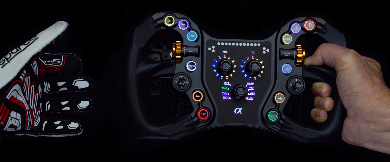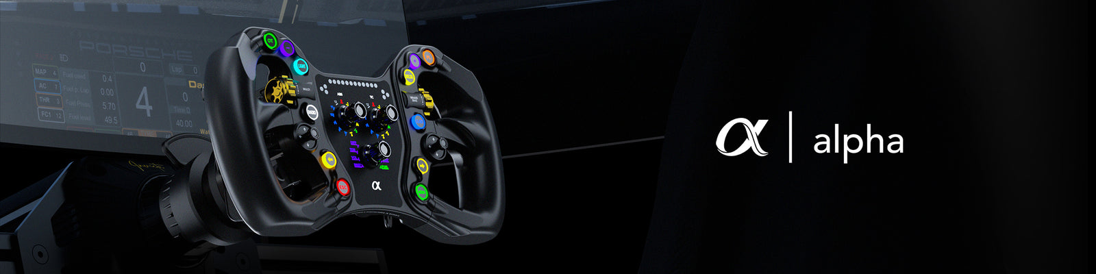 The Alpha is a premium 295mm sim racing wheel designed and built in Bavaria, combining high-end materials with a practical, racer-focused design. Its CNC-machined aluminum chassis and soft-touch silicone grips offer a solid, comfortable feel, while the RGB backlit buttons and customizable LEDs provide clear feedback without distraction. Available in both Standard and Advanced versions, the Alpha gives you flexibility depending on your setup, with optional analog clutch and extra paddles in the Advanced model. Built for durability and wide compatibility, it’s a reliable choice for serious sim racers who value quality.