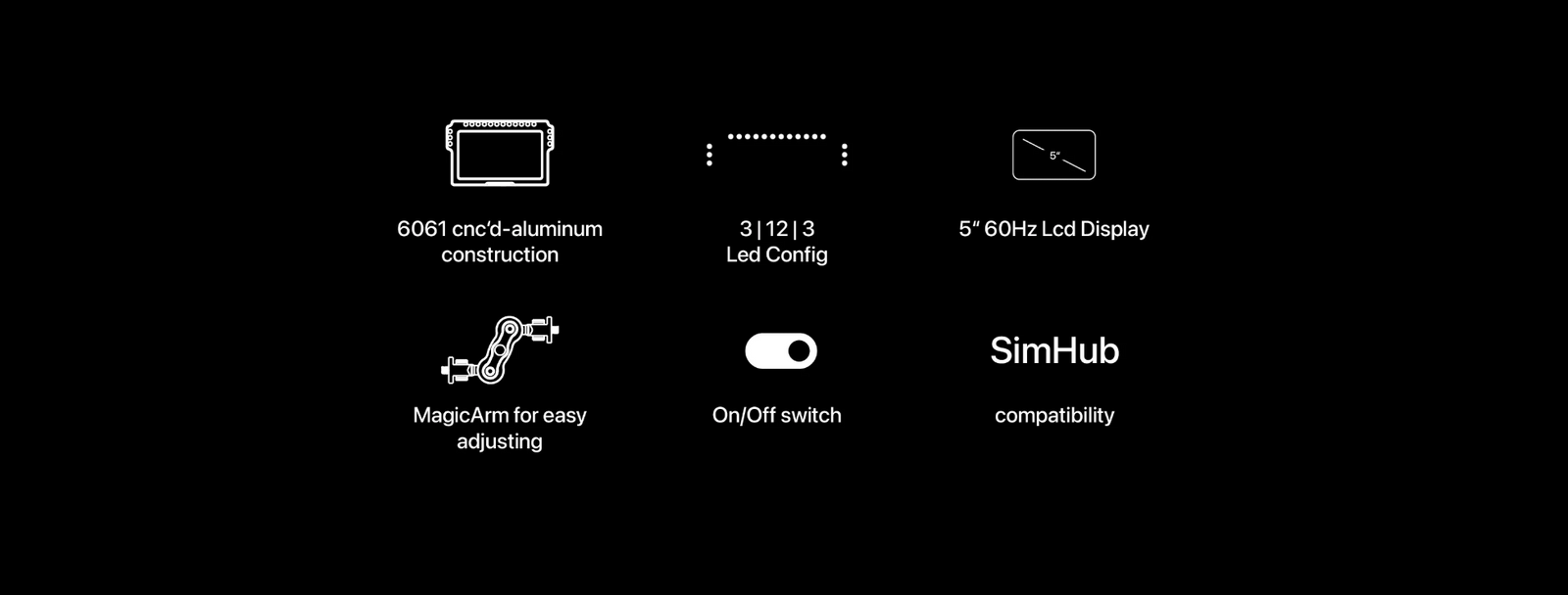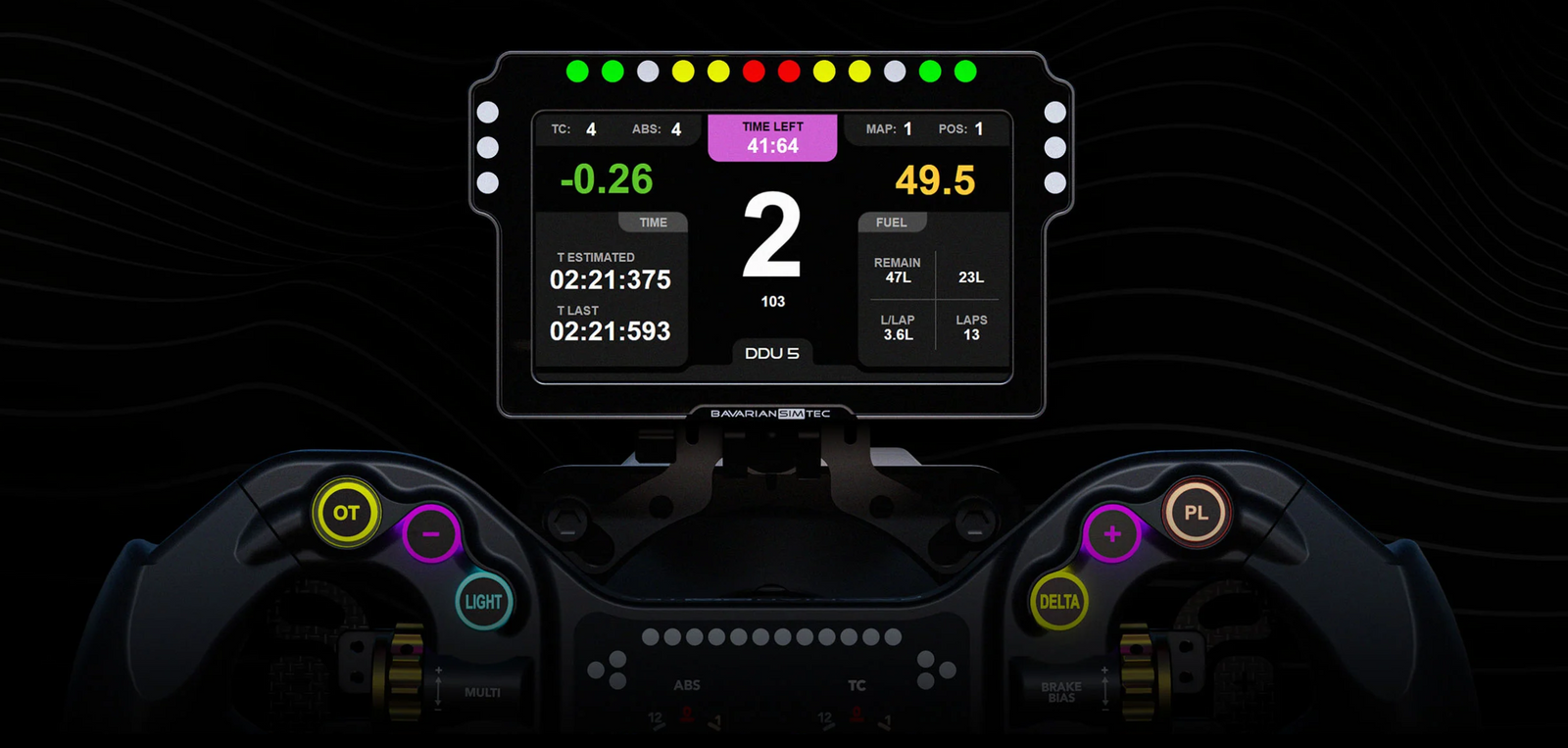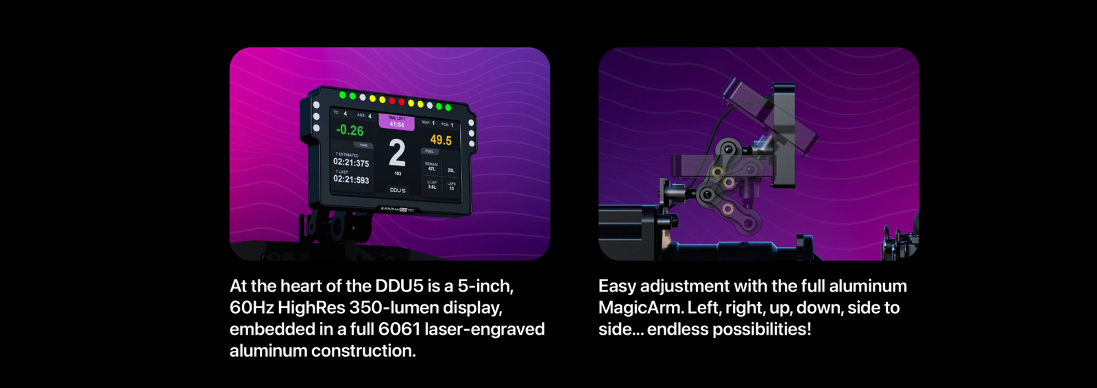The DDU5 is a professional-grade 5-inch digital dashboard display, precision-crafted in Bavaria to enhance your sim racing experience. Its sleek 6061‑aluminum housing and vibrant full-color LCD present telemetry data clearly and swiftly, helping you stay focused and informed during competition. Whether you’re tracking lap times, engine metrics, or tire wear, the DDU5 is designed to integrate seamlessly with SimHub, offering plug-and-play simplicity and advanced customization options.